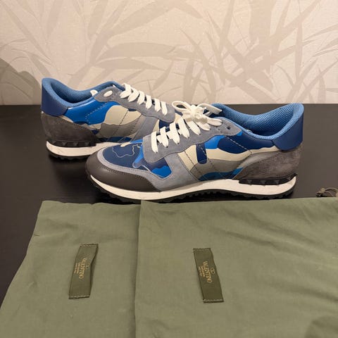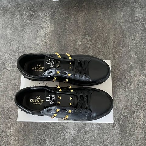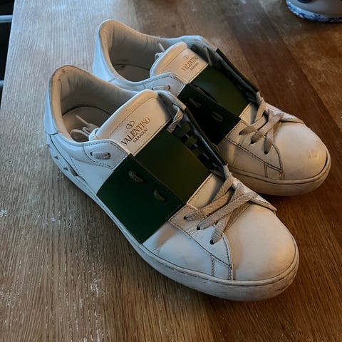 Valentino sneakers i storlek 43. Skorna är låga med snörning och är huvudsakligen vita med en bred svart rem över ovandelen. Tillverkade i läder med gummisula. Passar som vardagsskor eller fritidsskor. Klassisk sneaker‑modell med neutrala färger som fungerar till många olika typer av kläder.