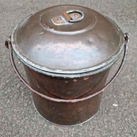 Vattenkittel i koppar med lock och handtag. Kitteln har en klassisk form med pip och uppfällbart lock på pipen. Ytan visar tydliga bruksspår och bucklor. Storleken framgår av bild med dunk på 10 liter som jämförelse. Passar som bruksföremål eller inredningsdetalj, exempelvis i kök eller som dekoration i äldre miljöer.