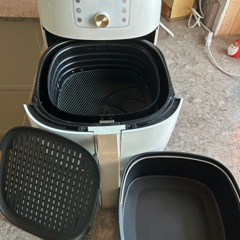 Luftfritösen på 6,2 liter rymmer 1000 g grönsaker, 8 kycklingklubbor, 5 laxfiléer eller 7 muffins.