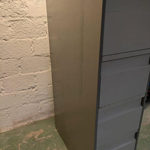 Bisley hurts i metall med sex utdragbara lådor. Färg grå. Passar för förvaring av papper, kontorsmaterial eller mindre föremål i hem eller på kontor. Kompakt modell som kan placeras på golv eller bänk.