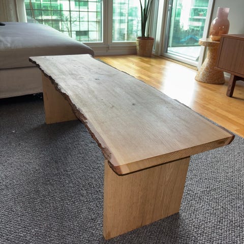 Jättefint soffbord/bänk/sideboard i ekfanér/ek. Hylla undertill med plats för t.ex. tidningar. Litet märke efter ett glas, se bild. Syns knappt. Modellen heter Acorn och kommer från Hübsch.