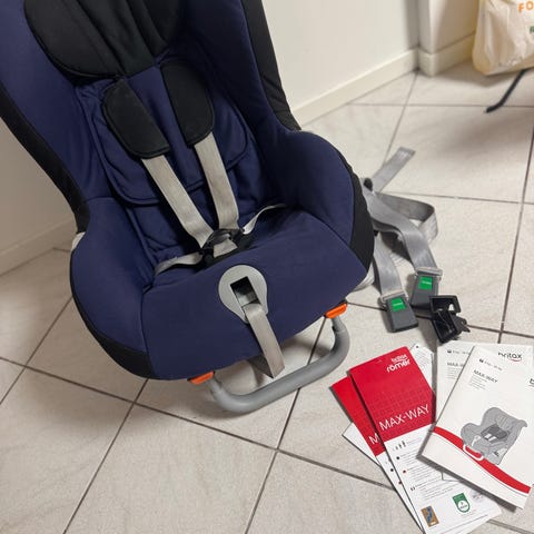 Britax Römer Max-Way Plus bilbarnstol för bakåtvänt åkande. Modellen är godkänd för barn upp till 25 kg. Stolen monteras med bilens trepunktsbälte och stödben, enligt anvisningarna på stolens sida. Klädsel i svart tyg och intern sele med justerbara axelremmar och bröstspänne. Passar för montering i baksätet utan aktiv krockkudde framför. Lämplig som bilbarnstol för småbarn som växt ur babyskyddet upp till ca 25 kg, beroende på barnets längd och vikt.