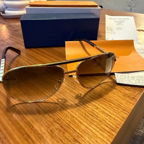 Louis Vuitton solglasögon för man. Modellen har svarta tonade glas och guldfärgad båge med metallinfattning. Klassisk form med dubbelt brynparti och näsbrygga i metall. Levereras med hårt fodral enligt bild. Passar som solskydd och accessoar vid vardagsbruk.