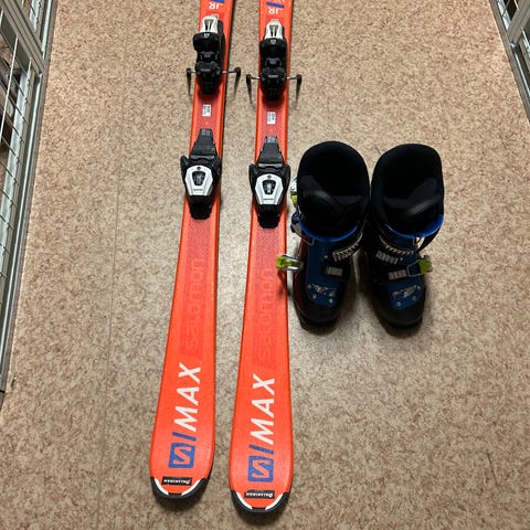 Salomon Force alpinskidor i längd 130 cm. Skidorna är blå med röda detaljer och har monterade bindningar. Undersidan är svart med stålkanter runtom. Passar som alpinskidor för piståkning.