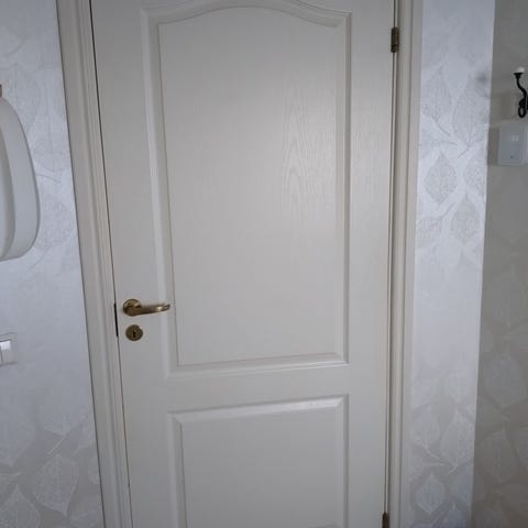 Innerdörr i trä med brun fanéryta. Klassisk slät modell i massivt trä.