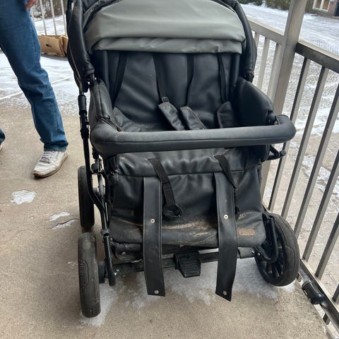 Emmaljunga syskonvagn chassi double viking 735 i svart utförande med två varukorgar under sittdelarnas fästen. Ena varukorgen saknar en plastdel i tyget så den har lite dålig stadga (men det går nog att klippa till och stoppa i ngt annat rätt så enkelt).