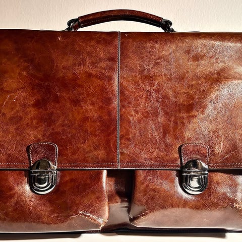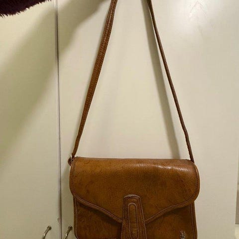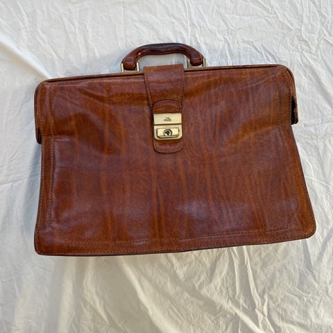 Väskan har en läderrem upptill med knapp för att stänga väskan, två handtag, en avtagbart justerbar axelrem, flera fack på insidan.