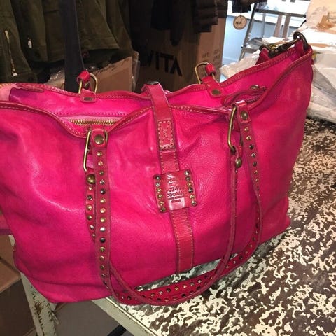 Campomaggi väska med både korta handtag och en lång justerbar axelrem. Väskan har en tryckt design på framsidan och en läderpatch på baksidan. Medföljer även en dustbags och en påse med lädervårdsprodukter. Dyr I inköp.