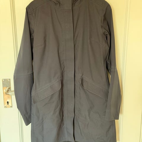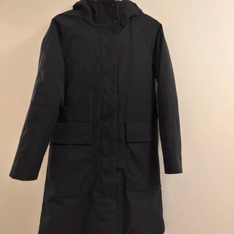 Black trench coat with a hood, long sleeves, and a zipper closure. It features a belt and gold-tone hardware.