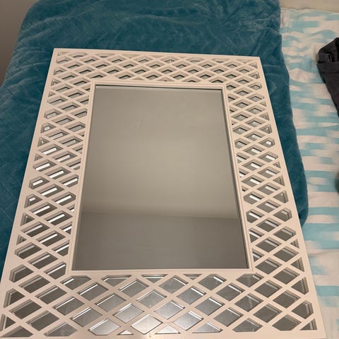 IKEA spegel med dekorativ, profilerad ram i vit färg. Rektangulär modell som kan användas i exempelvis hall, vardagsrum eller sovrum. Passar för väggmontering och fungerar både som praktisk spegel och som inredningsdetalj.