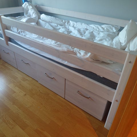Asta juniorsäng 90x200 cm i vitlackad träkonstruktion. Sängen har ribbotten i trä och är anpassad för madrassmått 90x200 cm. På ena långsidan finns en fast stödbräda som minskar risken för att barnet rullar ur sängen. Låg höjd från golvet gör den lätt att kliva i och ur för barnet. Passar perfekt som övergång från spjälsäng.
