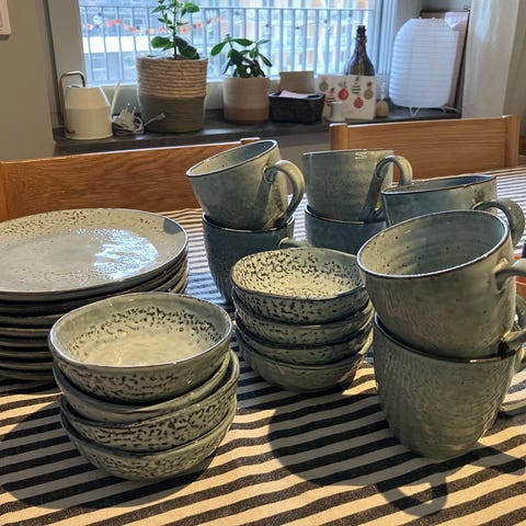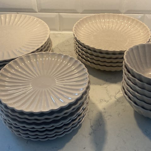 Ytan har en glaserad, något rustik struktur med synlig kant. Små märken på assietterna annars gott skick. Kommer hålla i många år till. Håller för maskindisk.