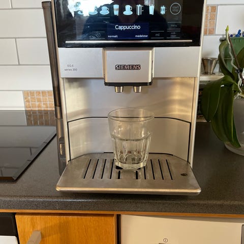 Siemens helautomatisk kaffemaskin i svart utförande. Maskinen har inbyggd bryggenhet och droppbricka framtill samt avtagbar vattentank på sidan. På ovansidan finns kontrollpanel med knappar och symboler för olika kaffedrycker, exempelvis espresso, kaffe, latte macchiato och cappuccino. Maskinen är avsedd för malning och bryggning av kaffe och kan användas i kök eller pausutrymmen där man vill tillreda olika typer av varma kaffedrycker från hela bönor