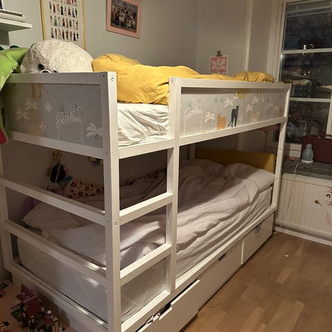 Mio Nora familjesäng i vitlackerat trä. Överslafen är 90 cm bred och underslafen 120 cm bred, avsedd för madrasser i längd 200 cm. Sängen har rak stege på sidan och skyddskanter runt överslafen. Passar som platsbesparande lösning i sovrum eller barnrum där man vill kombinera enkel- och dubbelsäng i en möbel.