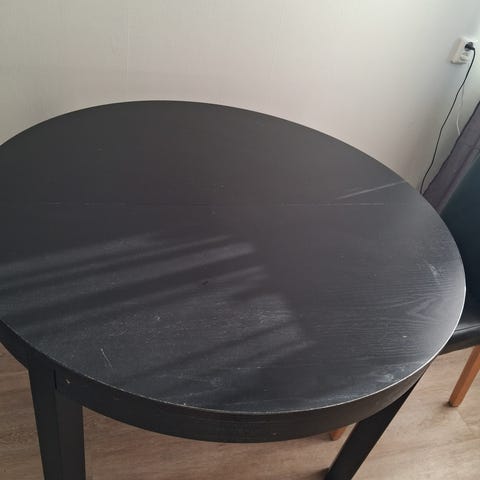 Ett litet större matbord och stolar. Helt okej skick med lite märken men annars fint. Finns möjlighet att göra bordet mindre.