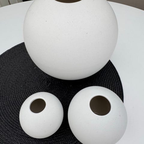 4Living dekorvaser och piedestal i keramik. Setet består av flera vita vaser i organiska, runda former med genombrutna hål samt en brun, kubformad piedestal. Vaserna är avsedda för inomhusbruk och kan användas som prydnadsföremål eller för torkade växter. Piedestalen fungerar som upphöjd bas för en av vaserna eller andra dekorföremål. Alla delar har etiketter från 4Living på undersidan med ursprungs- och skötselinformation.