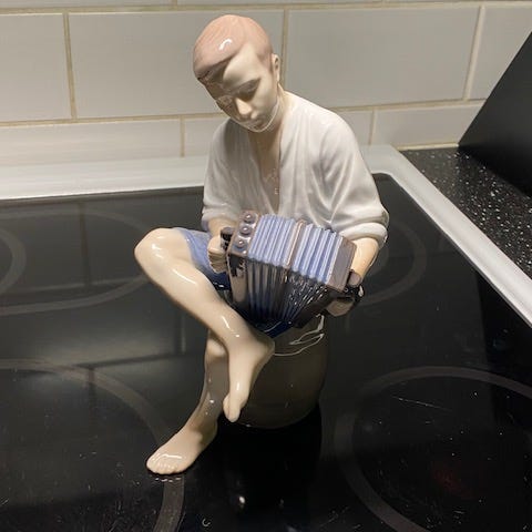 Bing & Gröndal fågelfigur "Optimisten" i porslin i blåvita och beige toner. Figuren föreställer en liten fågel med upplyft stjärt och detaljerad målning. Undersidan har stämpel från Bing & Gröndal. Passar som prydnad i hylla, på bord eller i vitrinskåp. Utan anmärkning. Första sortering.