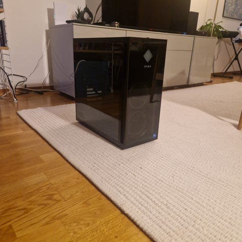 HP stationär dator i vitt chassi med sidopanel i glas. Datorn är byggd i ett tornchassi med god ventilation i ovandelen och frontpanel med USB- och ljudanslutningar. Passar för allmän datoranvändning, kontorsarbete eller hemmabruk beroende på installerad hårdvara.