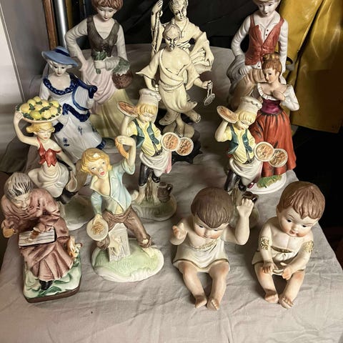 Porslinsfigur som föreställer ett par i 1700-talskläder. Figuren är flerfärgad med detaljerad klänning, kostym och dekorativ sockel. Undersidan har stämpel med krona och märkning. Passar som prydnad i hemmet eller som samlarföremål i vitrinskåp eller på hylla.
