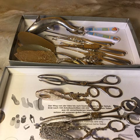 Set med flera sockertänger i nysilver. Olika modeller med dekorativa detaljer och graverade mönster. Passar för servering av sockerbitar eller mindre bakverk vid dukning och kafferep. 30 kr stycket.