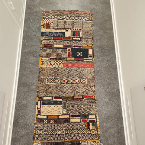 Denna handknutna Ait Ougherda-matta är ett unikt mästerverk av traditionellt hantverk. Varje tråd är noggrant vävd för att skapa komplexa, geometriska mönster inspirerade av naturen och kvinnorna i bergen där mattan har sitt ursprung. Naturlig ull i levande färger kombineras med silkestrådar som ger en subtil lyster och extra djup. Mattan är helt unik – ett totalt one of a kind-exemplar som inte finns någon annanstans i världen. En exklusiv och tidlös del av heminredningen.