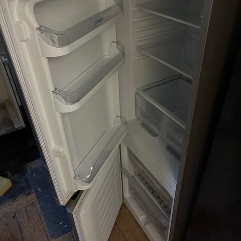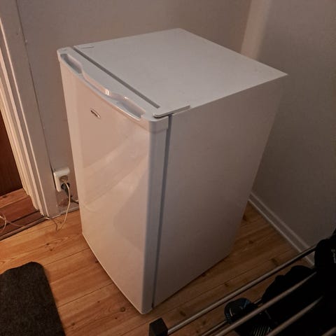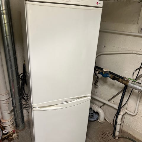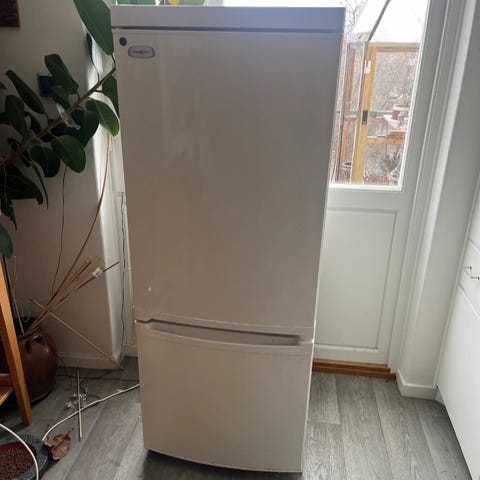Osäkert på märke, lite mindre kyl och frys cirka 1,4 m hög, fungerar som den ska. Har inte exakt mått