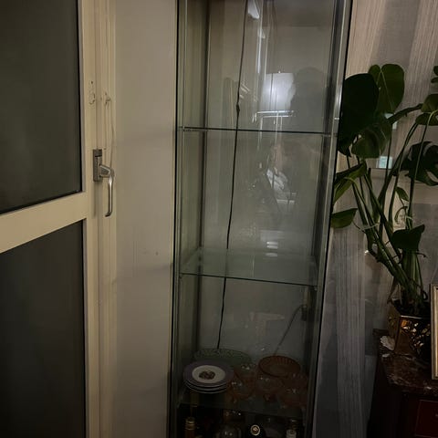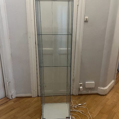 Säljer IKEA Detolf vitrinskåp i vit färg, en klassiker som har utgått ur sortimentet men fortfarande är väldigt populär som display-/vitrin-/samlarskåp.