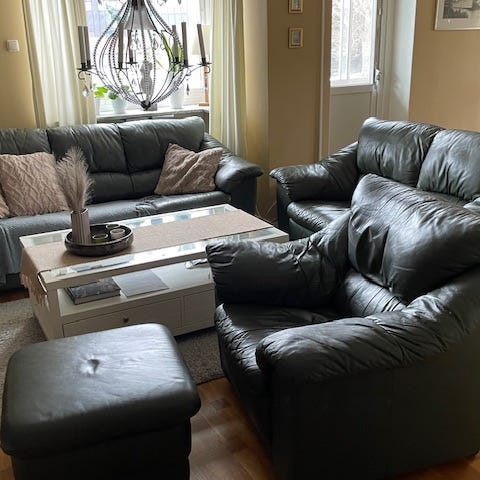 Soffgrupp, fåtölj skinnsoffor, soffbord