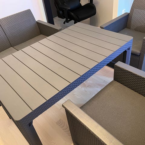 Matgrupp för utomhusbruk bestående av rektangulärt bord och stolar. Bordet har skiva och ben i metall med slät, träliknande yta. Stolarna är tillverkade i svart konstrotting med armstöd och metallben. Passar för placering på altan, balkong eller uteplats och ger sittplatser runt bordet för flera personer vid måltider och samvaro utomhus.