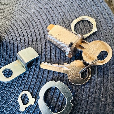 ASSA Dörrlås sats med cylinderlås och handtag. Innehåller låshus, slutbleck, två runda cylindrar, ASSA 1212, 4 nycklar, täckbrickor och skruvar. Passar för montering i ytter- eller innerdörr där cylinderlås önskas. Mått på låshuset, ett ASSA ABLOY Connect 2002 sym framgår delvis av måttstocken på bilden, kontrollera mot befintlig dörr innan montering.