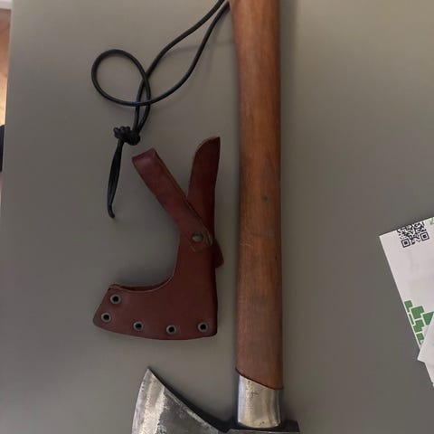 Kniv yxa läderfodral Tyskland kniv D Peres skaft av horn längd ca 24cm yxa märkt DGM länder ca 24cm bruksslitage repor märken