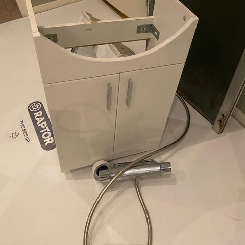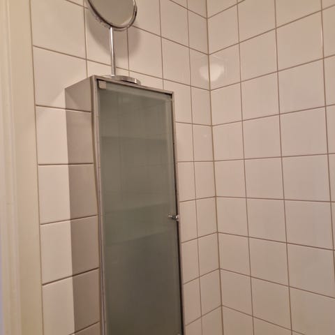 Spegelskåp för badrum med två spegeldörrar. Skåpet har spegelfront och vit ovankant. Avsett för montering på vägg ovanför handfat eller kommod. Ger förvaring för badrumsartiklar samtidigt som det fungerar som spegel.