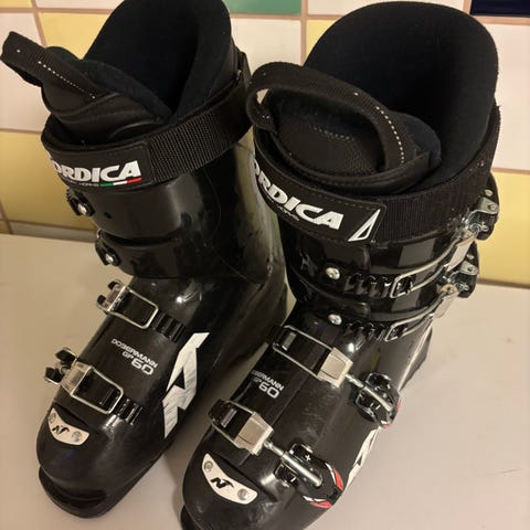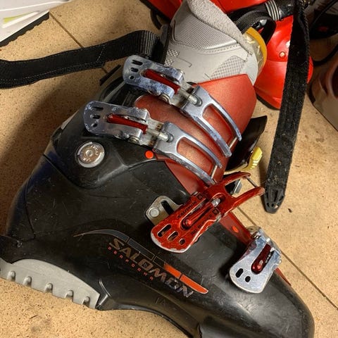 Salomon Team alpina pjäxor i svart färg med vita och silverfärgade spännen. Modellen har tre justerbara spännen och vadderad innersko för stöd och komfort. Storlek 25-25.5 (cirka 39)