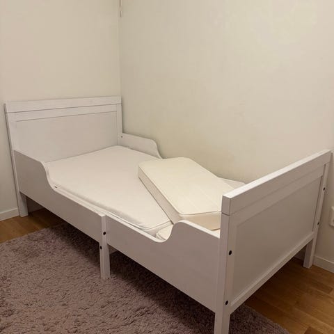Vit IKEA SUNDVIK utdragbar barnsäng i gott skick, säljs tillsammans med IKEA LURÖY ribbotten samt madrass