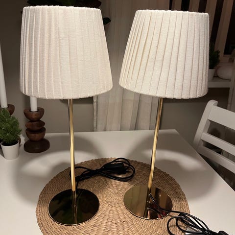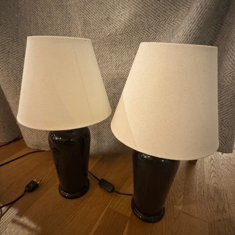 2 stycken jättefina bords/fönsterlampor. Totalt 51 cm höga. Den ena svarta ”plastkoppen” som glödlampan skruvas ner i har öppnat sig. Jag har haft lite svart eltejp om. Fungerar som den ska. 200kr/styck.