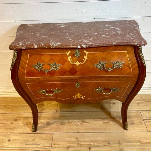 Rokokobyrå i mahogny med fina intarsia inlägg, marmorskiva. Tidigt 1900-tal