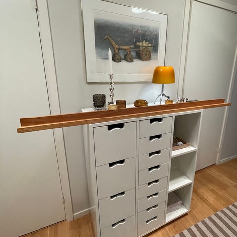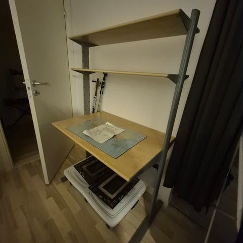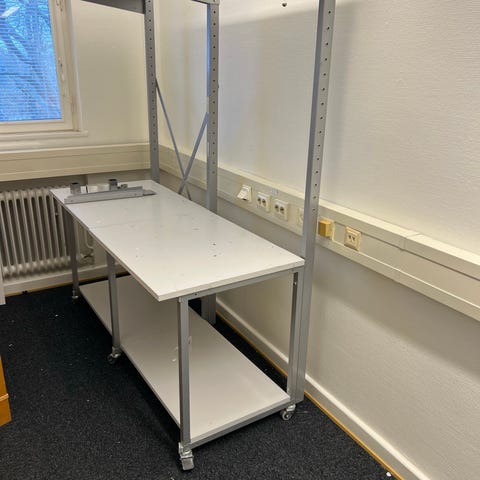 Väldigt bra yteffektivt bord, kan användas som t.ex arbetsbord eller matbord. Bra förvaringsmöjligheter med de 2 hyllplanen (överst och nederst) samt hyllplanen inuti boxen. I bra skick med några småmärken.