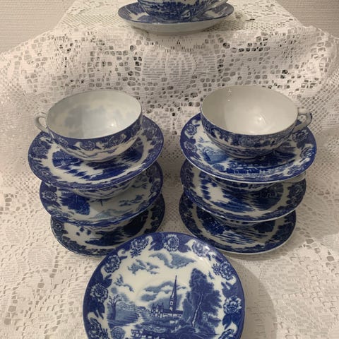 Vackert mönstrade i blått, 5 st äldre kaffekoppar med fat från Terra import samt 8 st extra fat ur annan serie. Allt i nyskick. Kan skickas med PostNord