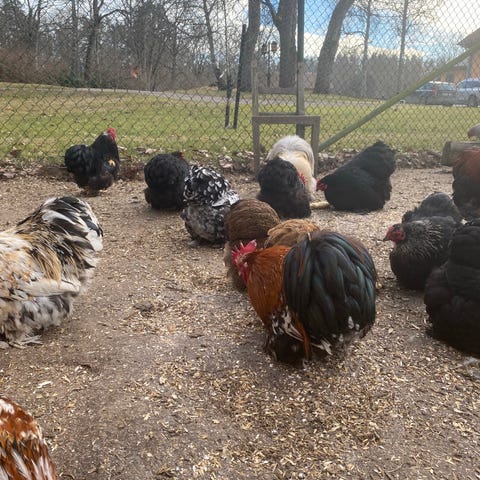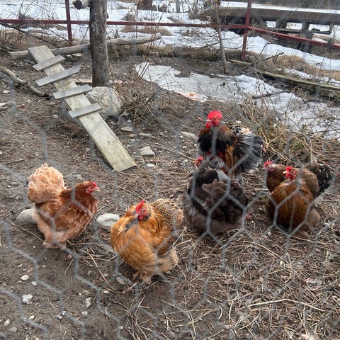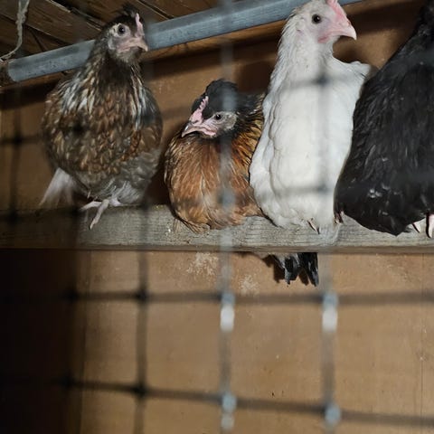 Blandrad grupp med unghönor i olika färger. 4-5 stycken. Ålder 1-2 år. Värper bra!