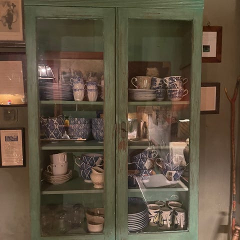 Skänk i brunlackerat trä med profilerade dörrar och svängda ben. Möbeln har två skåp med hyllplan samt ett mittskåp med draglådor. mörk textilklädd insida som passar för bestick eller mindre föremål. Ovanpå finns en slät träskiva som kan användas som avställningsyta. Passar som förvaringsmöbel i exempelvis vardagsrum eller matsal.