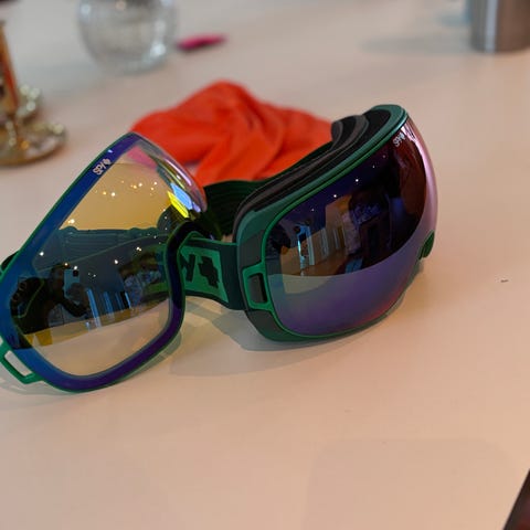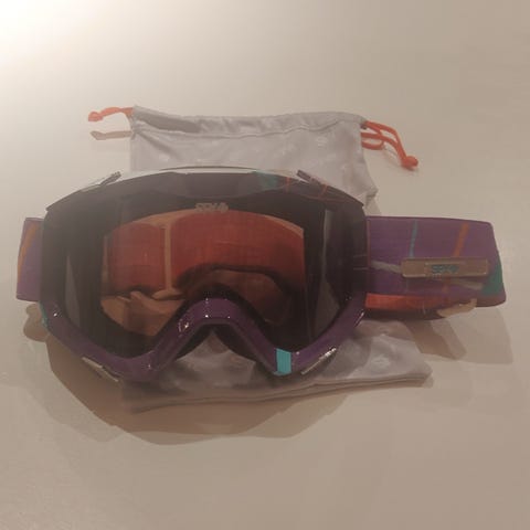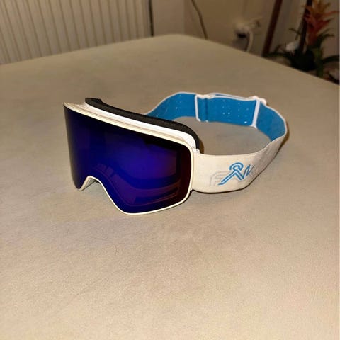 Skidglasögon med svart ram och tonat visir. Justerbart svart band med detaljer i metall. Levereras med vit tygpåse för förvaring. Passar för användning vid skidåkning eller andra vintersporter där ögonskydd behövs. Nypris ca 6000 kr. Säljes billig pga föråldrat foam/skumpackning runt om så bör bytas för den händige (finns replacement på nätet)
