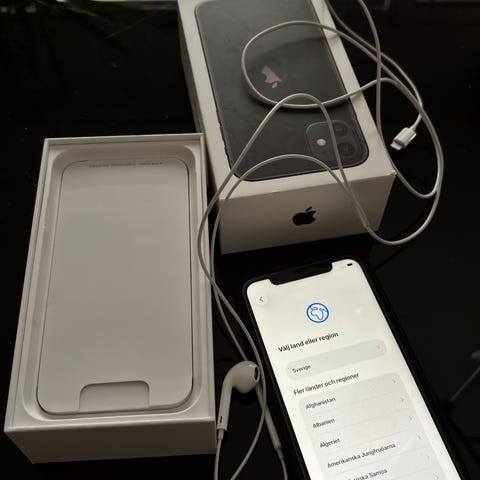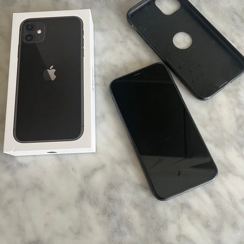 Apple iPhone 11 smartphone med 64 GB internminne. Enheten visas i svart färg med dubbla kameror på baksidan och helskärmsdesign på framsidan. Passar för vardaglig användning som samtal, meddelanden, surf, appar och mediauppspelning.