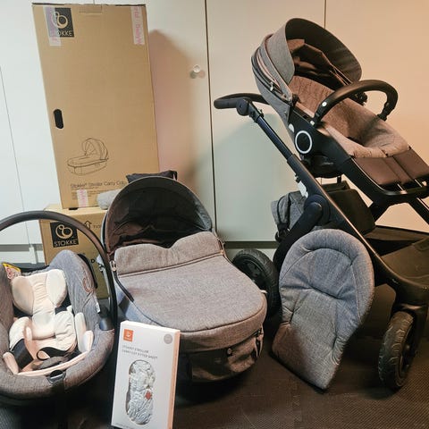Stokke barnvagn med både liggdel och sittdel i grå textil på svart chassi. Det som ingår i priset är regn / myggnät och paraply. Skötväska i samma färg från stokke