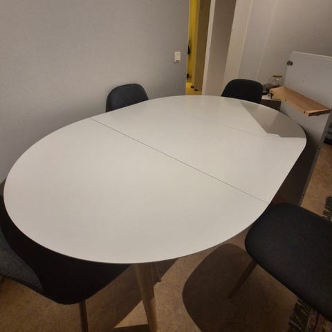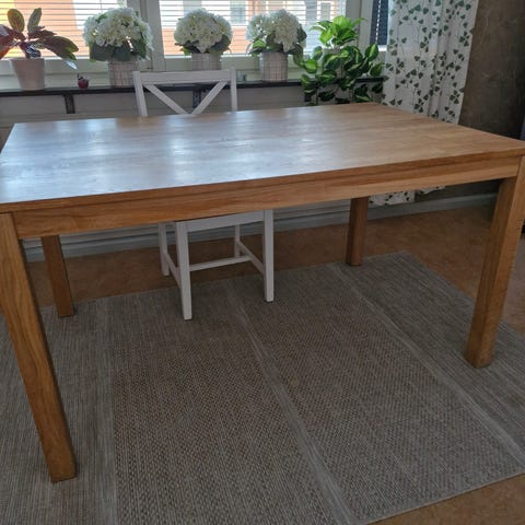 I använt skick, flammig på bordsskivan, se bilder. Mörkare där bordstabletterna varit.