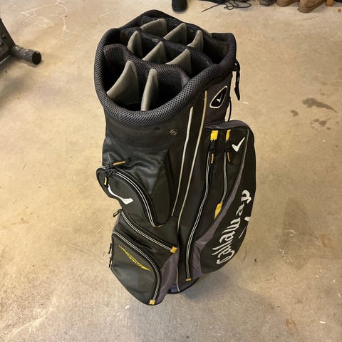 Spalding executive waterproof golfbag i grå och blå färg. Väskan har flera ytterfickor med dragkedja för förvaring av tillbehör. Topp med flera separata fack för klubbor ger organiserad fördelning. Bärhandtag på sidan underlättar hantering. Materialet är vattenavvisande för att skydda innehållet vid fuktiga förhållanden. Passar för golfspelare som behöver en rymlig och praktisk bag för klubbor och utrustning.