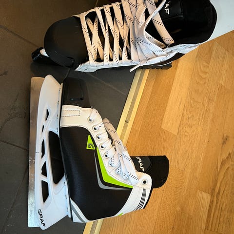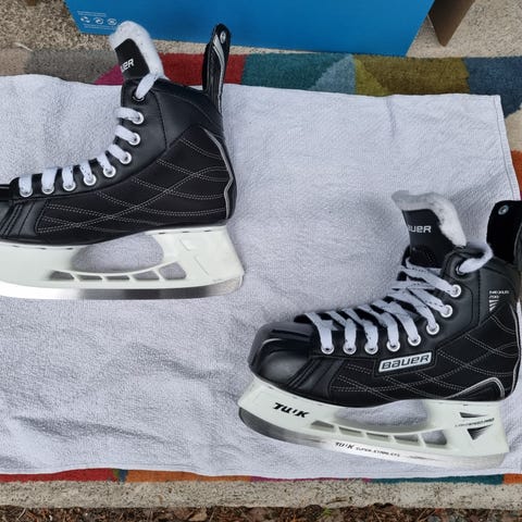 Bauer ishockeyskridskor i storlek 42. Färg svart med vita detaljer. Klassiska ishockeyskridskor med snörning och fasta skenor. Lämpliga för ishockey och allmän åkning på is för vuxen eller äldre ungdom med skostorlek runt 42. NY SLIPPADE