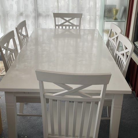 Ett mycket rustikt och fint matbord samt 6 stolar från Nordiska hem. Allt är i bra skick, men finns en liten repa på bordet (se bild)