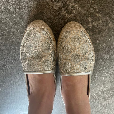 H&M loafers i storlek 40. Beige flätad ovandel med svart kantband och svart textdetalj framtill. Platt sula och stängd tå. Passar somrigt vardagsbruk och lättare utomhusaktiviteter.