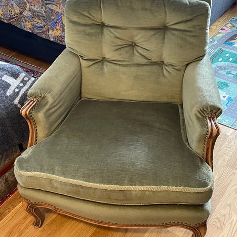 En väldigt fin grön fåtölj i sammetstyg med mässingben, inköpt på Ellos.