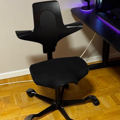 Säljer en HÅG Capisco Puls 8010 – en av marknadens mest populära ergonomiska sadelstolar. Perfekt för höj‑ och sänkbart skrivbord och för dig som vill sitta aktivt och avlasta rygg, höfter och axlar.